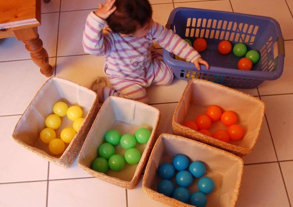 Le matériel de tri est idéal pour les enfants de 18 mois. Ils permettent de développer la logique en triant par couleur, forme ou dimension. C’est une façon très Montessori de découvrir la catégorisation.
